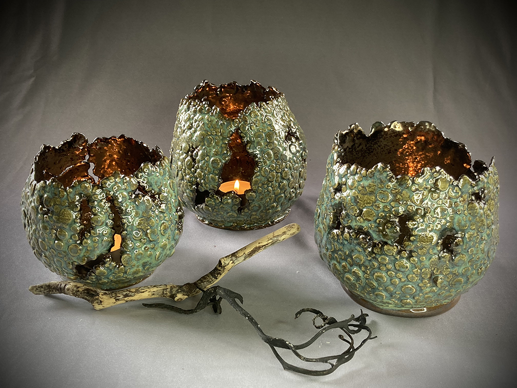 Her ‘Shipwreck’ pots are thrown on the wheel and then altered by adding textures. She reworks the shape on the wheel, exploring the possibilities of the clay’s characteristics—creating holes, slits, and jagged edges that give each pot its individuality.