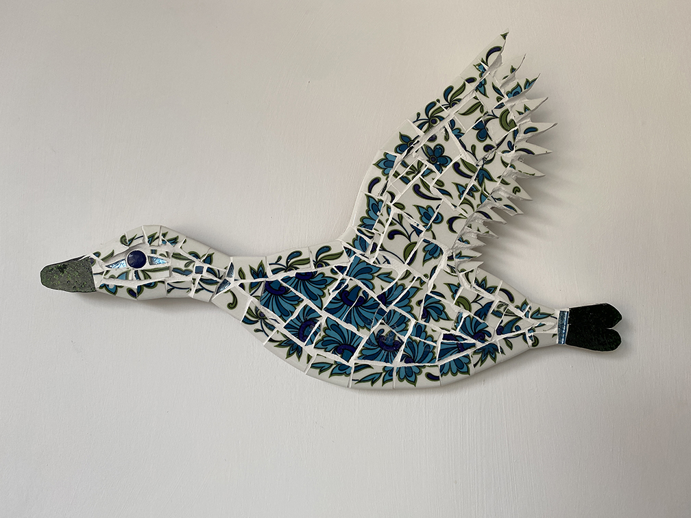 Alan creates nature-inspired mosaics using tiles, china, glass, and found items. Each piece is handmade, making every creation unique.